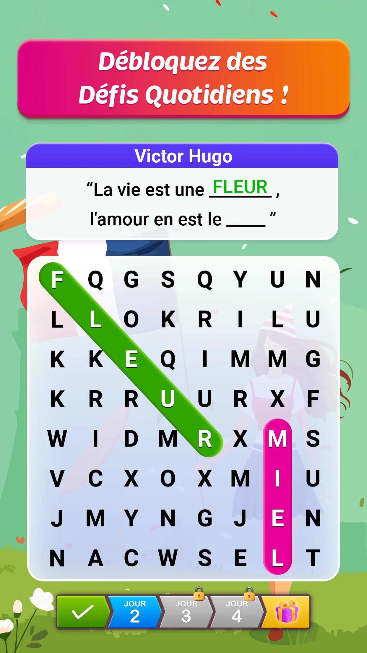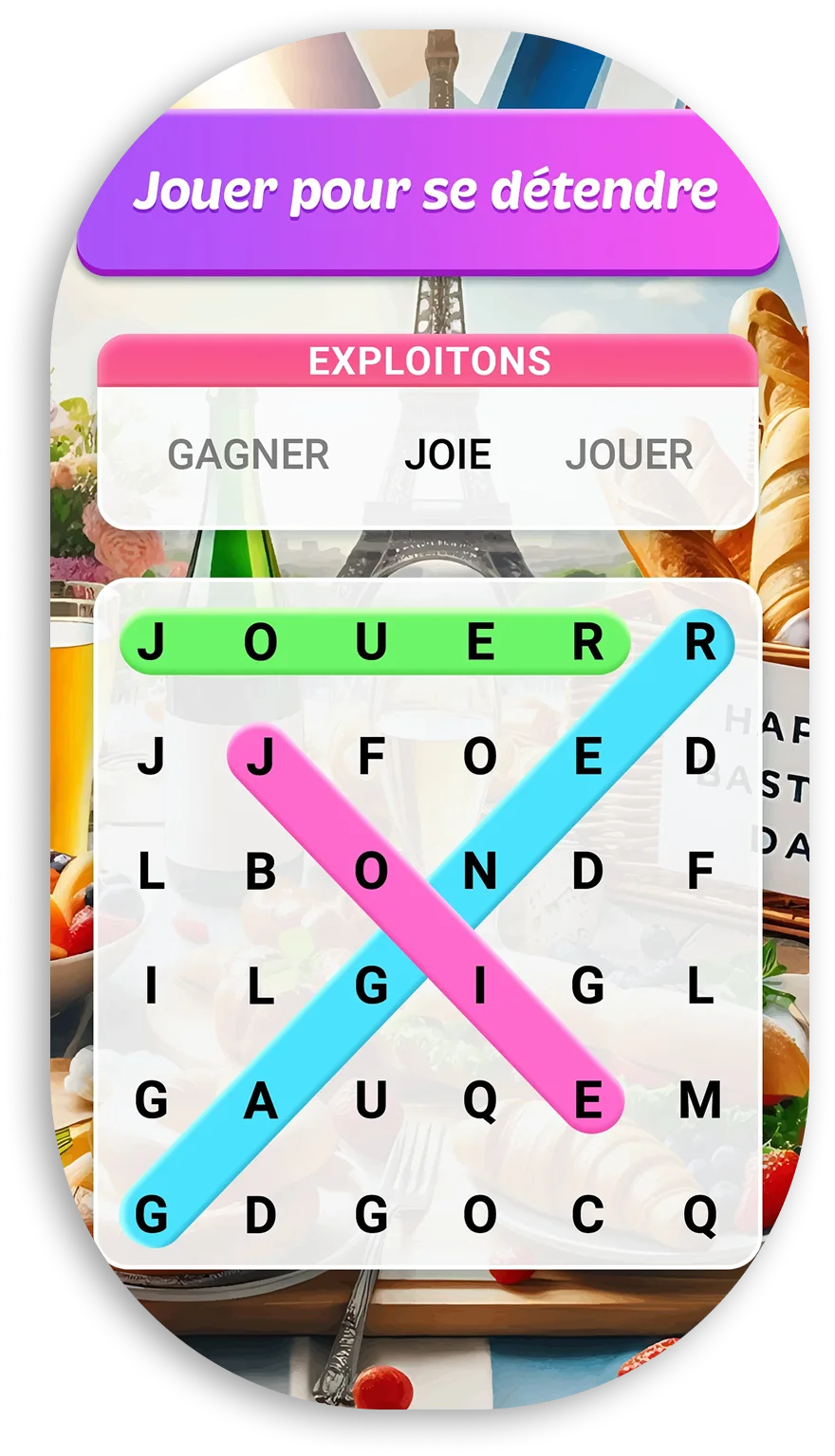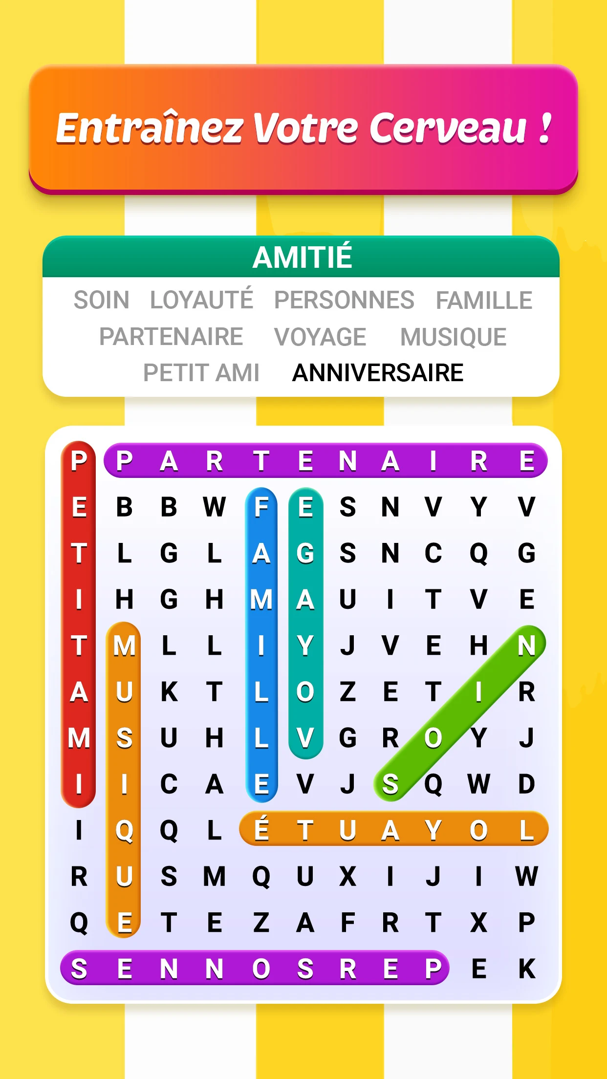 Word Search Puzzle est un jeu de mots gratuit conçu pour celles et ceux qui aiment apprendre en s'amusant. Nous combinons le plaisir des mots croisés à l'entraînement mental, en proposant des centaines de niveaux, des paysages inspirants et une difficulté croissante. Notre objectif est de faire de l'enrichissement du vocabulaire et du développement des capacités cognitives un rituel quotidien ludique. Rejoignez les milliers de joueurs qui développent déjà leur potentiel en faisant glisser leur doigt sur l'écran!